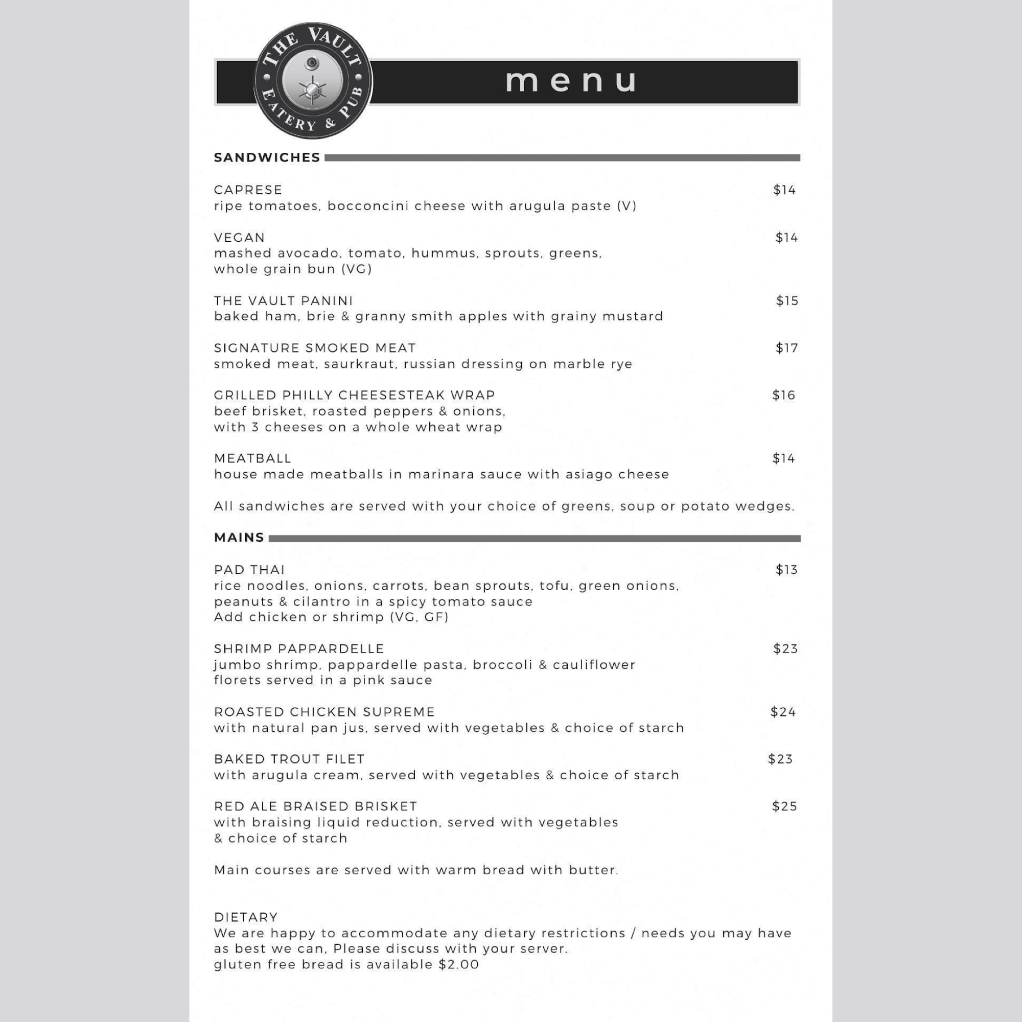 View The Vault Eatery & Pub Menu