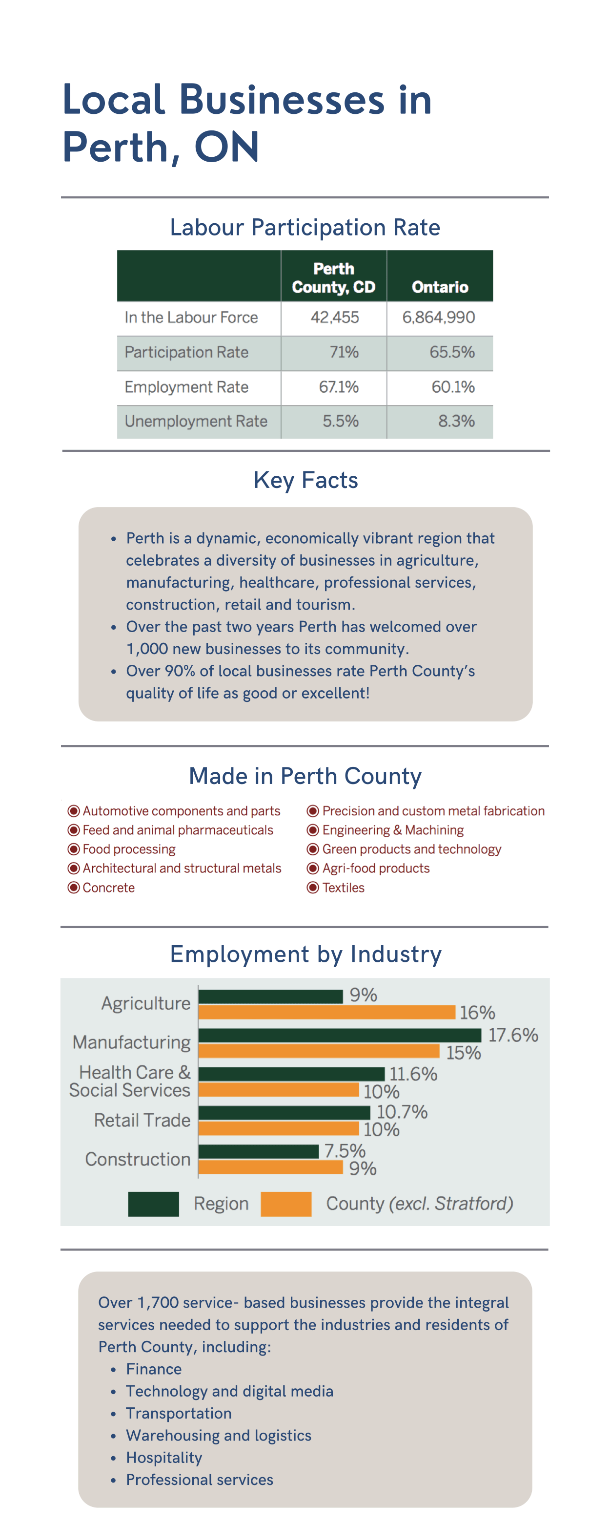The economy of Perth has been cited as an example of small-town durability in the twenty-first century. While many small towns in North America have lost their manufacturing companies and are struggling to adapt, Perth has remained an industrial excellence and innovation center. Perth is a significant economic hub in Eastern Ontario, with a GDP of over $1 billion and more jobs than people.
