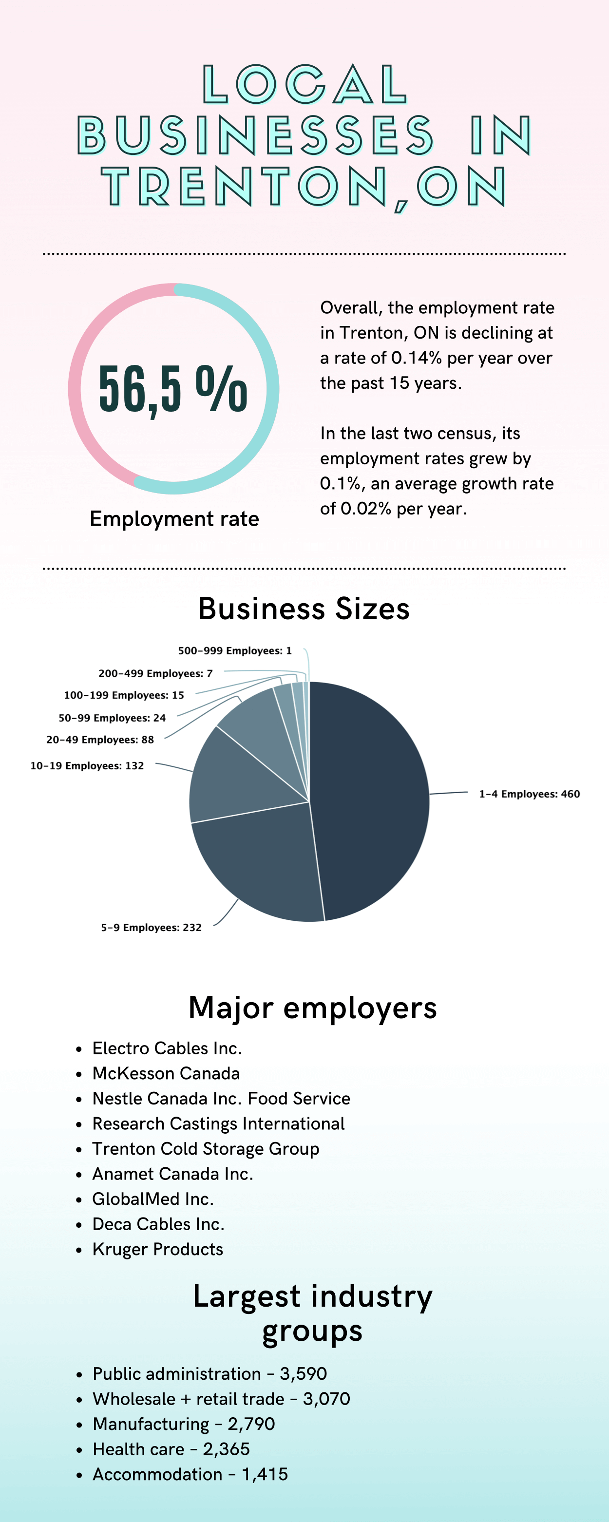 Trenton Cold Storage, Norampac, Mapco, Citipack, Jobsters, Pentair Thermal Controls, Nestlé, ElectroCables, Domtech, Global Med Inc. (Schauenburg), Mckesson Canada, and DECA Cables are among the other major employers.